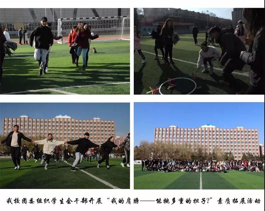 2、校团委组织学生会干部开展“我的肩膀——能挑多重的担子 ”素质拓展活动。